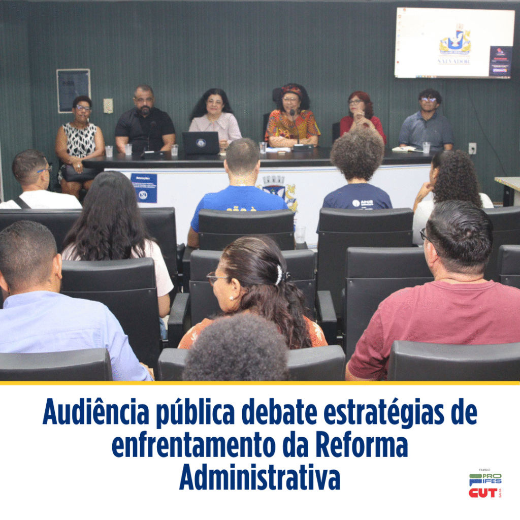 A nova proposta de reforma administrativa (PEC 38) é uma ameaça para as/os trabalhadoras/es e a população em geral: tomando como ponto de partida o falso discurso de “combate aos privilégios”, ela põe em risco a qualidade dos serviços públicos, acaba com a estabilidade dos servidores públicos e beneficia o grande capital. Esses foram os principais pontos debatidos na Audiência Pública sobre a Reforma Administrativa, iniciativa da APUB e do mandato da vereadora Marta Rodrigues, realizada na manhã da última segunda (15/12), no Auditório do Edf. Bahia Center. A audiência foi gravada e está disponível no Canal YouTube do Sindicato: Além da presidenta do Sindicato, professora Raquel Nery, e da vereadora Marta Rodrigues, a mesa foi composta pelos vereadores Silvio Humberto e Hamilton Assis; o vice-presidente do PROIFES, Flávio Silva; a presidenta da CUT-BA, Leninha Valente; a supervisora do DIEESE, Ana Georgina; e o diretor do DCE UFBA, Joan Ravir. Como encaminhamento da Audiência, a ata da discussão será encaminhada para os deputados e senadores que representam a Bahia, bem como para o deputado Hugo Motta e para o prefeito Bruno Reis. Além disso, ficou alinhada a realização de um ato no mês de janeiro, para sensibilizar a população a juntar-se à causa do enfrentamento à Reforma Administrativa. A professora Raquel Nery foi a primeira a fazer uso da fala. Depois de saudar os integrantes da mesa, ela fez uma linha do tempo das inúmeras tentativas de Reformas Administrativas, tendo o golpe contra a presidenta Dilma como ponto de partida. A presidenta teceu duras críticas à ideia de professores como “privilegiados”: “Não temos privilégios. Temos uma carreira que dura 20 anos de sua base até o topo. Nosso reajuste é sempre resultado de muita luta. Desde o golpe da presidenta Dilma, ficamos sete anos sem mesa de negociação, com perdas salariais que nem sequer foram recuperadas. E agora precisa de uma PEC que atinge as pessoas que mais precisam do serviço público, em nome da modernização do estado brasileiro e da extinção de privilégios?” O vice-presidente do PROIFES, Flávio Silva, foi o segundo a falar. Em sua apresentação, o professor trouxe dados relevantes a respeito da quantidade de servidores bem como a proporção de servidores em cada uma das esferas administrativas. Ele desmentiu, com dados, um dos principais mitos que envolvem a reforma administrativa, o de que o Brasil gasta muito com o serviço público. “O Brasil tem 12,4% de servidores em relação à população economicamente ativa. Isso equivale a quase metade da proporção dos países da OCDE”, explicou. A Supervisora Técnica do DIEESE, Ana Georgina Dias, foi a próxima a fazer uso da palavra. Depois de agradecer à APUB pela iniciativa da Audiência Pública, ela trouxe à tona um problema que já acomete o serviço público, mesmo em governos progressistas: o alto número de trabalhadores terceirizados e temporários. “O Estado não pode ser visto como uma empresa privada, porque o objetivo é outro. Ele não foi feito para dar lucro, foi feito para dar resultado”, analisou. Já a presidenta da CUT-BA, Leninha Valente, analisou a conjuntura política e os limites de um governo progressista, que precisa lidar com um parlamento de maioria conservadora e sem compromisso com a melhoria dos serviços públicos para os cidadãos. “As reformas administrativas são sempre propostas a título de modernização. Mas isso que chamam de ajuste fiscal, a gente sabe que é um arrocho”, criticou a presidenta da CUT. Representando o movimento estudantil, Joan Ravir, da direção do DCE UFBA, chamou a atenção dos impactos que uma Reforma como a que está sendo pensada pode ter para o movimento estudantil. “Quando a gente trata desse desmonte, a gente vê o quanto é importante que os servidores tenham os seus direitos garantidos, por isso acaba impactando na saúde dos servidores e dos estudantes também”, avalia. O vereador Hamilton Assis chamou a atenção para a necessidade de enfrentar a Reforma Administrativa junto com a população. “Precisamos pensar em como a gente envolve os usuários de serviços públicos, porque é extremamente grave o que estão acontecendo”, avalia. Ele também relacionou a Reforma proposta a um mecanismo de necropolítica. “Quando você precariza o serviço para quem mais precisa, você está decidindo quem vai viver e quem vai morrer”. O vereador Silvio Humberto chamou a atenção de que, com um Congresso conservador como o atual, não adianta o Governo fazer o “dever de casa” sozinho. Também chamou a atenção de que, embora os defensores da Reforma abracem a narrativa de que o estado é “ineficiente”, não há um interesse real na “eficiência”, que melhoraria os serviços públicos e aumentaria a arrecadação. Fonte: APUB-Sindicato