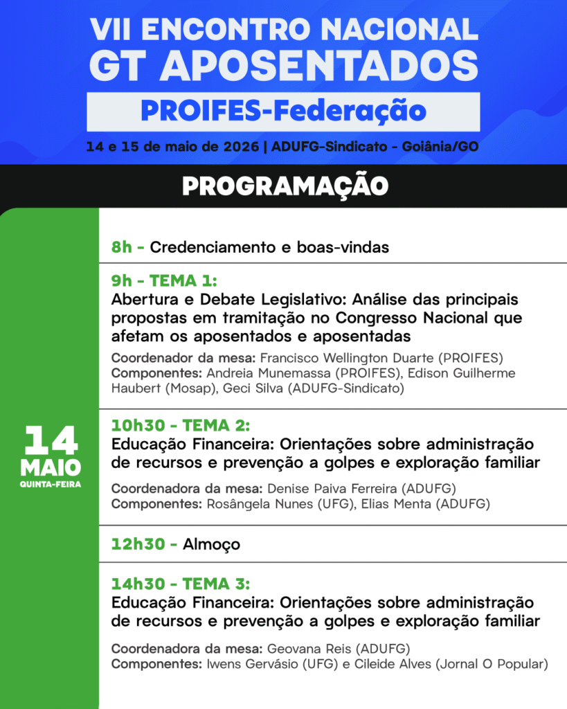 Os debates e apresentações abordarão desde questões que impactam diretamente os direitos dos aposentados federais, na análise de propostas em tramitação no Congresso Nacional, passando por assuntos de interesse geral, como a orientação sobre educação financeira, e, ainda, temas relacionados à importância da atuação dos aposentados nos sindicatos.