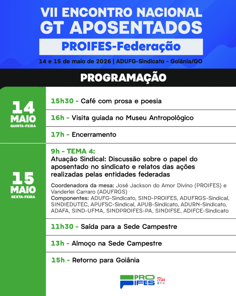 A expectativa para este ano é superar o número de participantes do último encontro nacional, realizado em 2023, no Maranhão, que culminou na publicação da ‘Carta de São Luís’, documento que colaborou efetivamente nos encaminhamentos que nortearam a atuação do GT de Aposentaria do PROIFES-Federação, desde então.