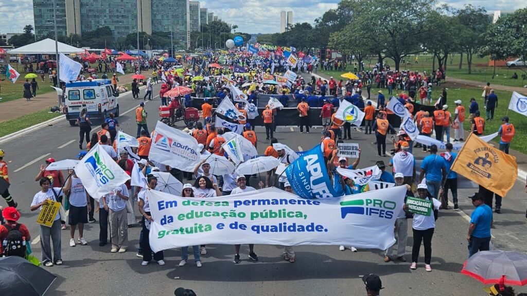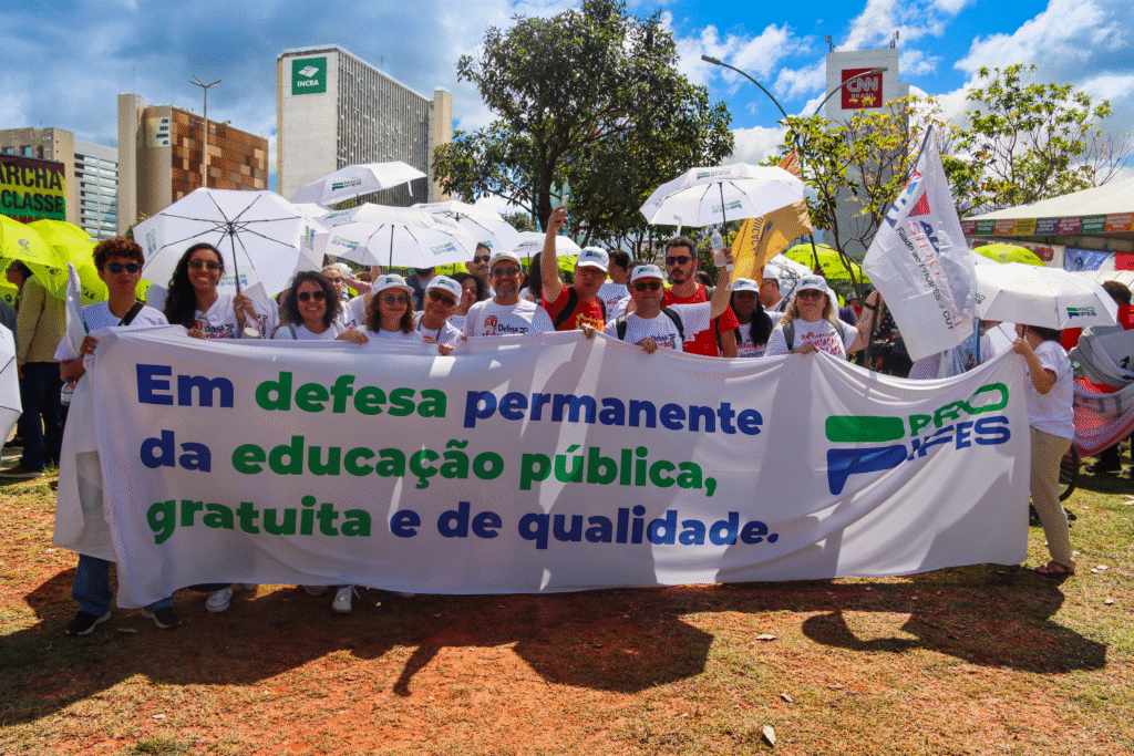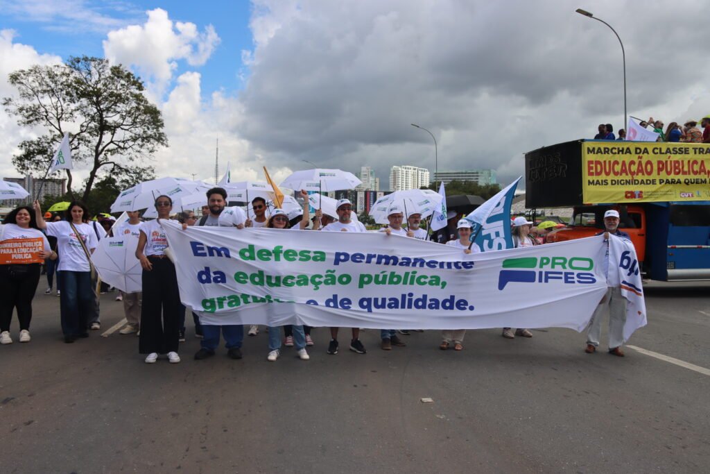 Representado por seus diretores e professores, o PROIFES contou com o reforço de estudantes, parceiros das lutas e reivindicações, e seguiu o trajeto, desde o Teatro Nacional até o Congresso, com suas já tradicionais sombrinhas brancas.