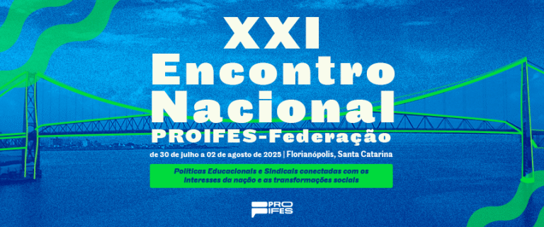 O PROIFES-Federação realizará o seu XXI Encontro Nacional com o tema: “Políticas Educacionais e Sindicais conectadas com os interesses da nação e as transformações sociais”. O evento será um importante espaço de debate e formulação de diretrizes para a atuação da Federação. A cidade de Florianópolis sediará o encontro entre os dias 30 de julho e 02 de agosto no Hotel Majestic.