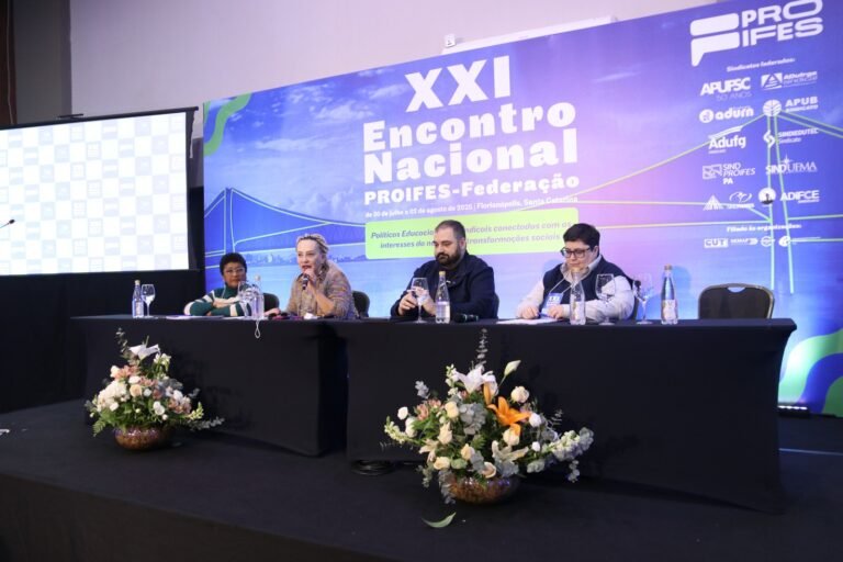 Identificada como uma mulher negra com forte traço indígena, a professora da UFRN, Vilma Victor Cruz, contestou o racismo na carreira docente e fez uma crítica à ausência de mulheres negras e indígenas nas mesas de discussão dos eixos do Encontro Nacional do PROIFES-Federação. Ela retomou a contribuição do II Seminário LGBTQIAPN+ sediado em Porto Alegre, em junho deste ano.